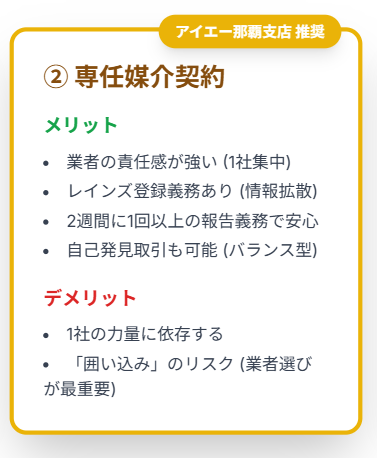 • 那覇市の特性: 那覇市内はエリアによって需要が大きく異なります。相続案件も多いため、地域密着で親身に戦略を立てる「専任媒介」が有利に働くケースが多いです。