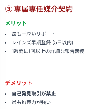 最後に、3つの中で最も拘束力が強く、最も手厚いサポートが期待できる「専属専任媒介契約」です。