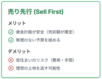• ・売り先行: 資金計画が安全。売却額確定後に購入予算を組める。ただし、仮住まいが必要になる可能性。