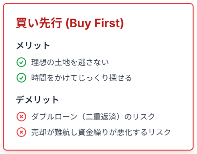 • デメリット: 仮住まいのリスク、理想の土地を逃す可能性。
